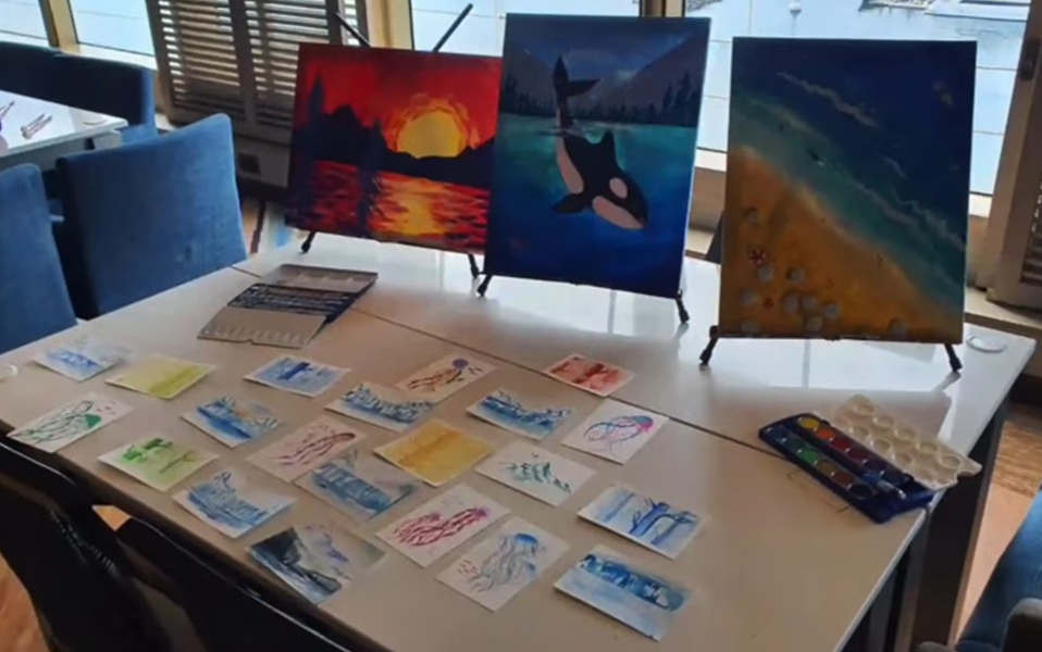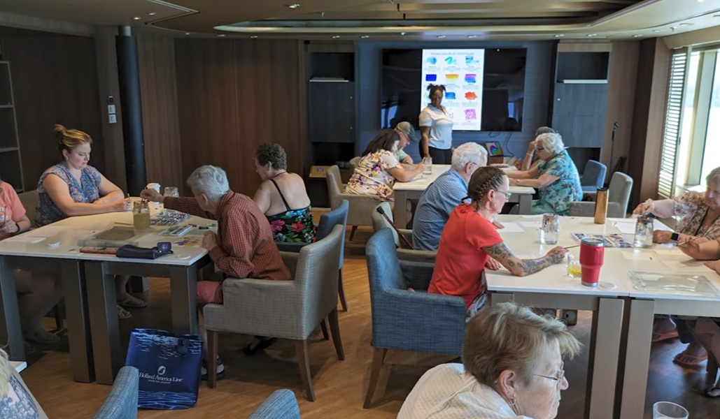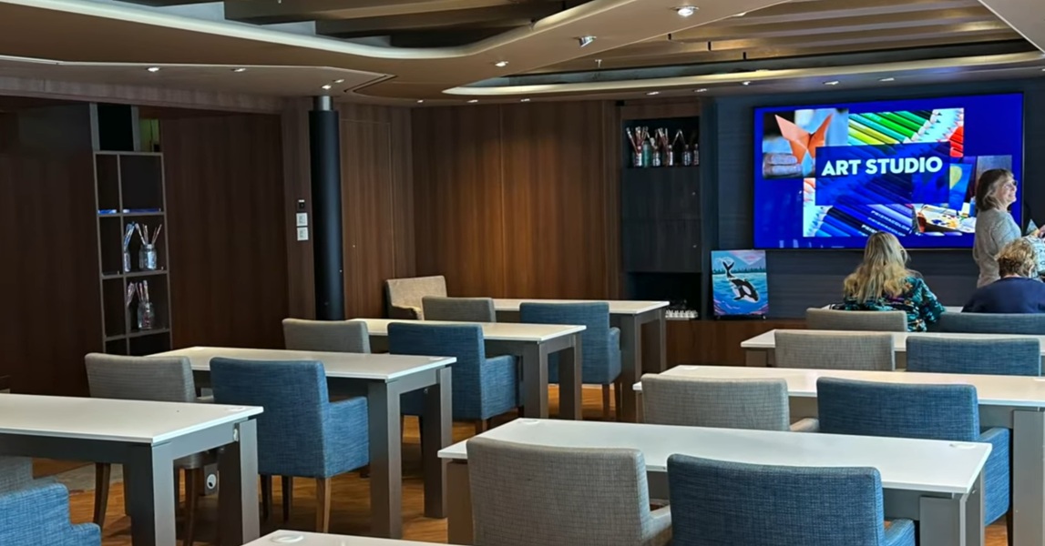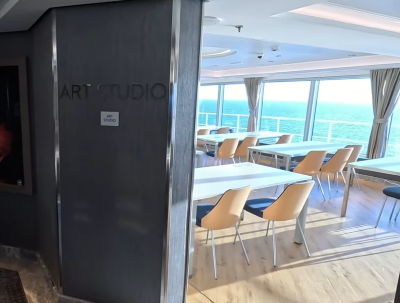 TheArt Studio (forward port side Deck 11 - Observation Deck adjacent to The Crow's Nest) offers the opportunity to create art or crafts including origami, knitting, calligraphy, watercolor painting, painting on canvas (additional fee charged), creating designs from doodles, or even coloring for adults.
