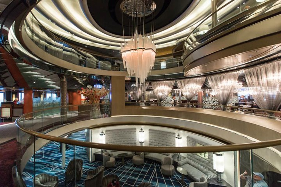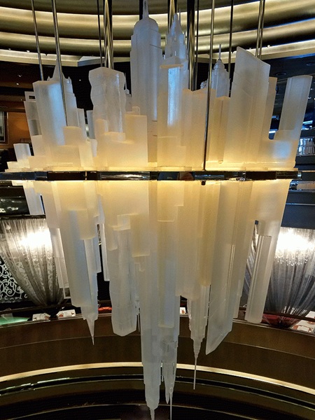 On the Nieuw Amsterdam it's also, without question, the most elegant and one of the most beautiful spots on board. At its center is a huge glass chandelier created for the Nieuw Amsterdam by husband and wife Italian artists Gilbert LeBigre and Corinne Roger. The piece is an abstract sculpture of the New York skyline made from translucent blocks.