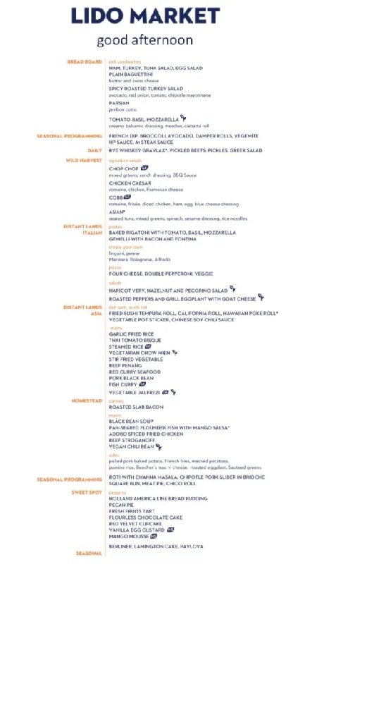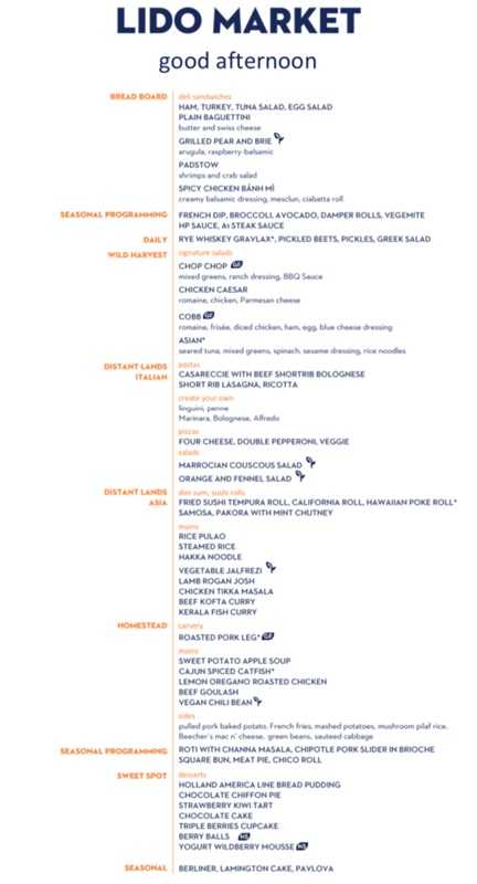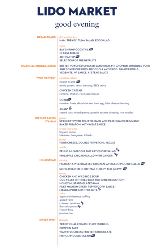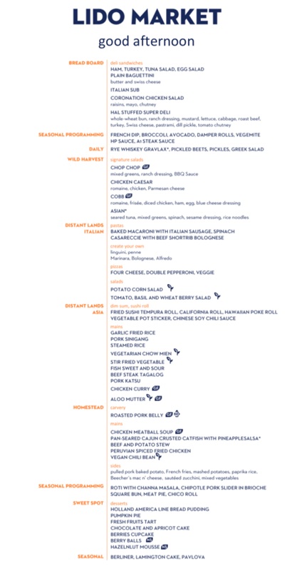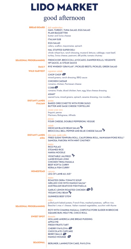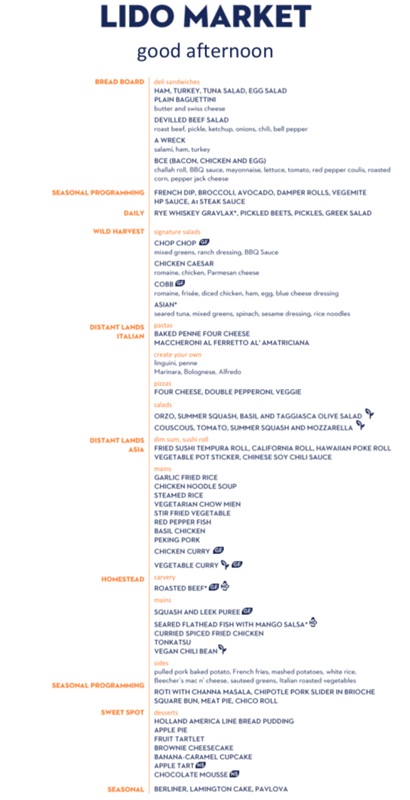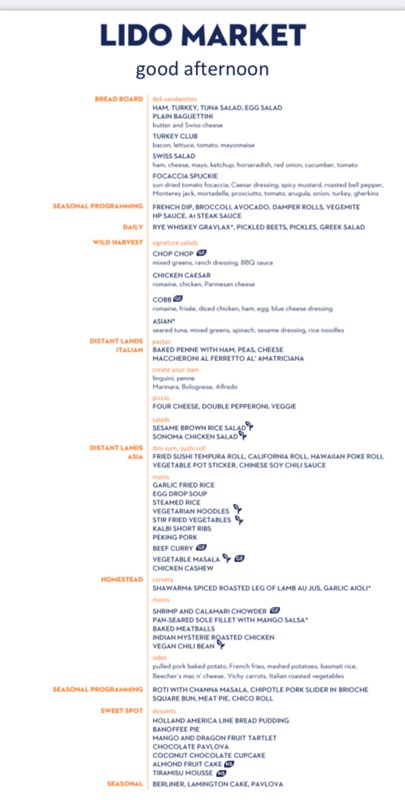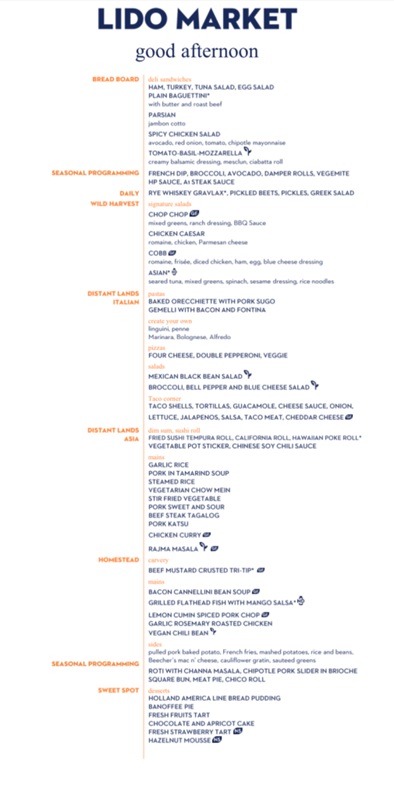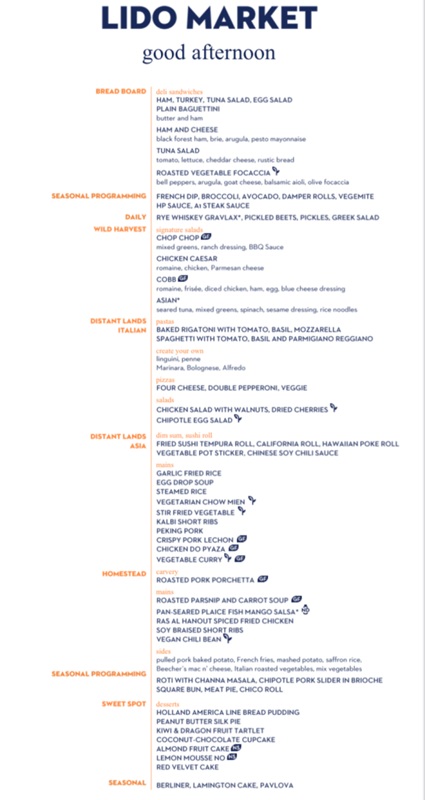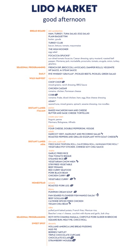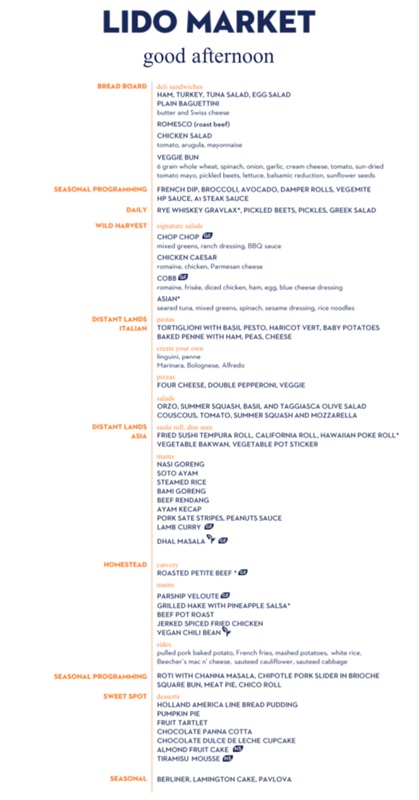 The Lido Market, one of the two principal Nieuw Amsterdam restaurants (the other is The Dining Room) included in your cruise fare, serves Breakfast, Lunch, and Dinner in a buffet format.