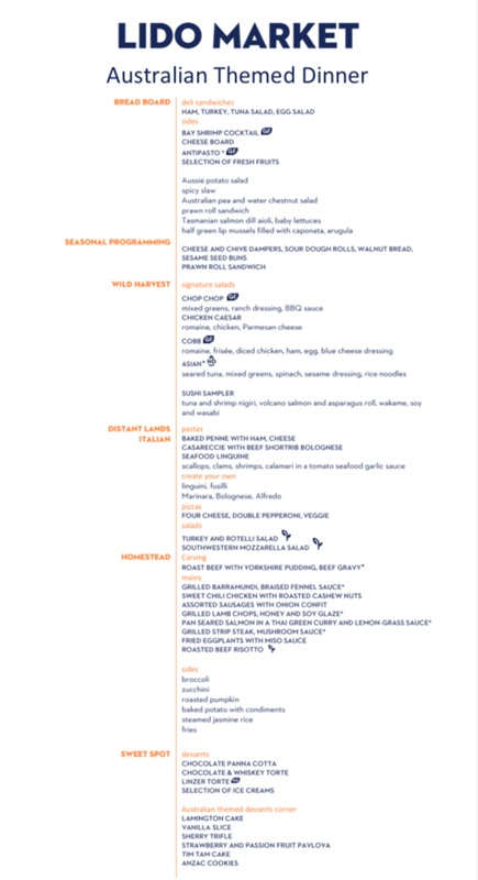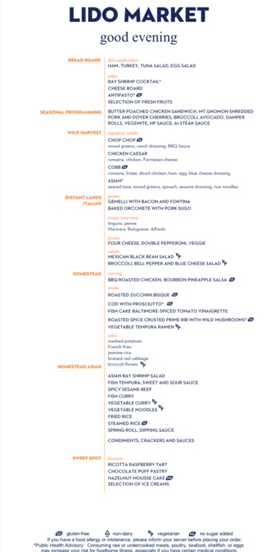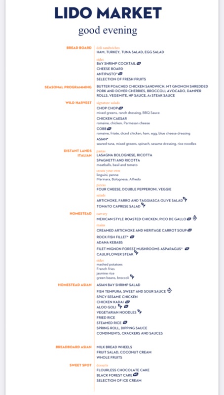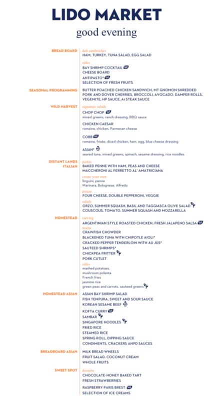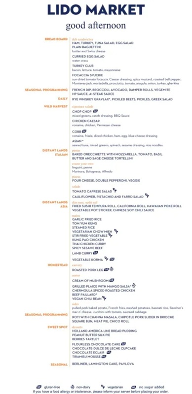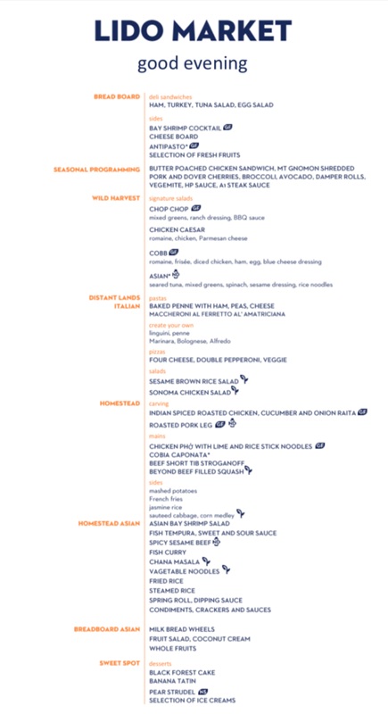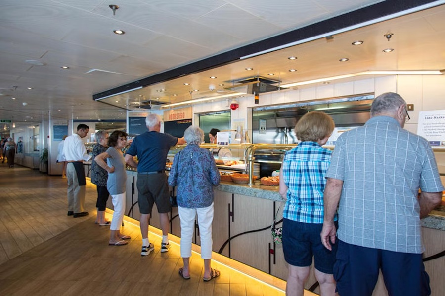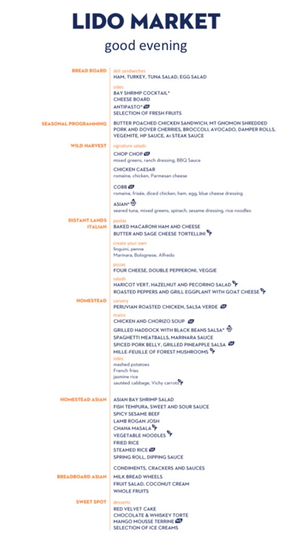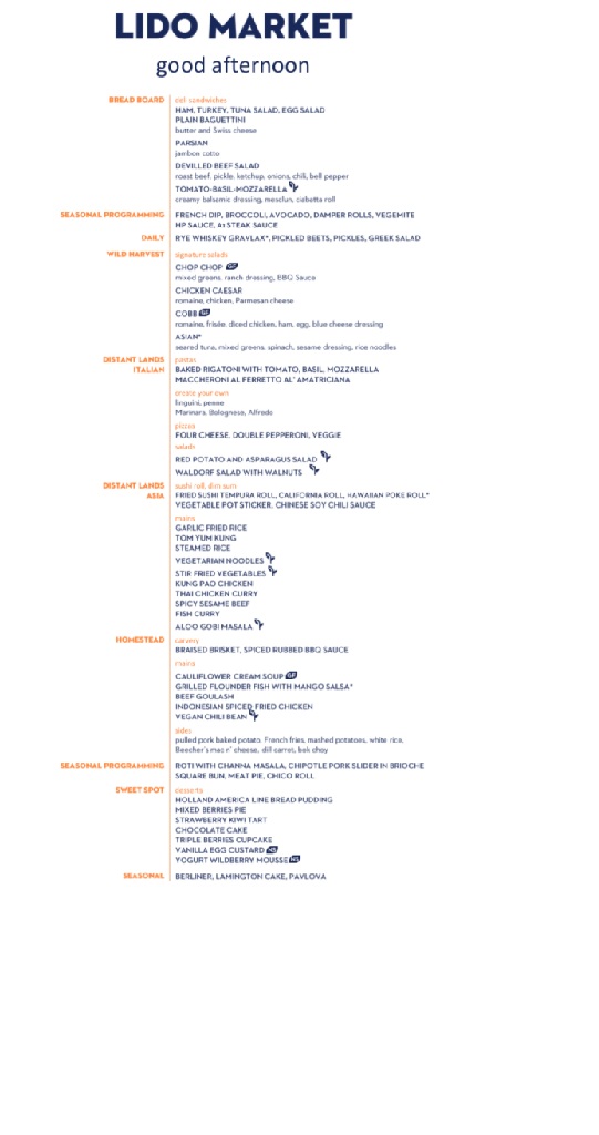 The Lido Market, one of the two principal Nieuw Amsterdam restaurants (the other is The Dining Room) included in your cruise fare, serves Breakfast, Lunch, and Dinner in a buffet format.