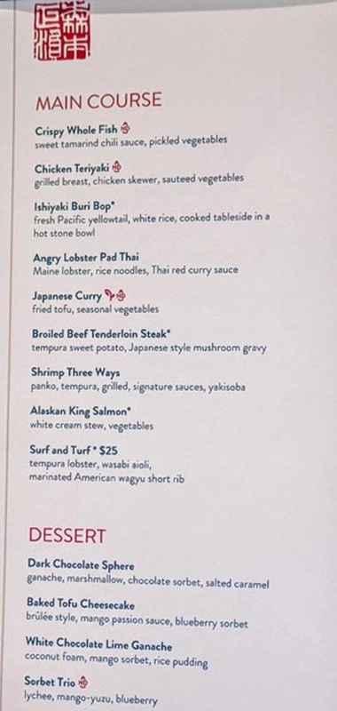 Please note that the menu for Morimoto by Sea is expected to vary to feature the fresh fish available in a given cruise itinerary. As a result, your menu may vary from the one below.