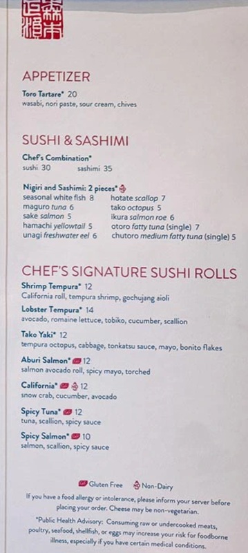 As with all the specialty restaurants, Morimoto by Sea comes with an additional charge. The additional charge includes one entree per person plus as many appetizers, side dishes and desserts you'd like to try.