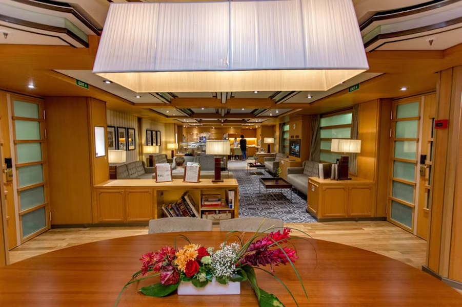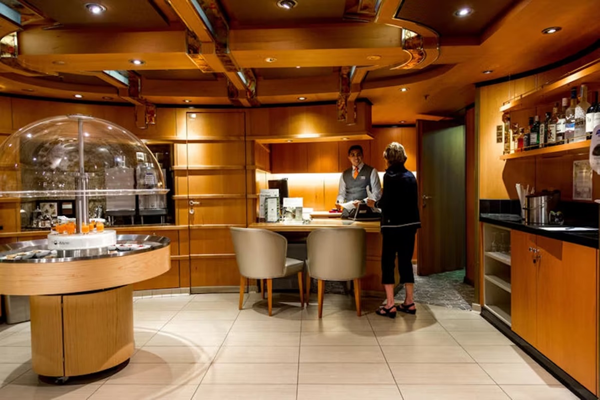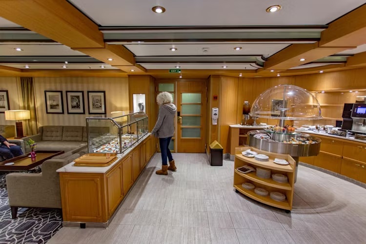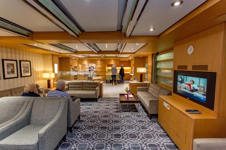 The Neptune Lounge (midships Deck 7 - Rotterdam Deck) is available only to those in Neptune Suites and Pinnacle Suites. It has a television, comfortable seating, light food and beverages, and a concierge. The only thing it lacks is an ocean view.