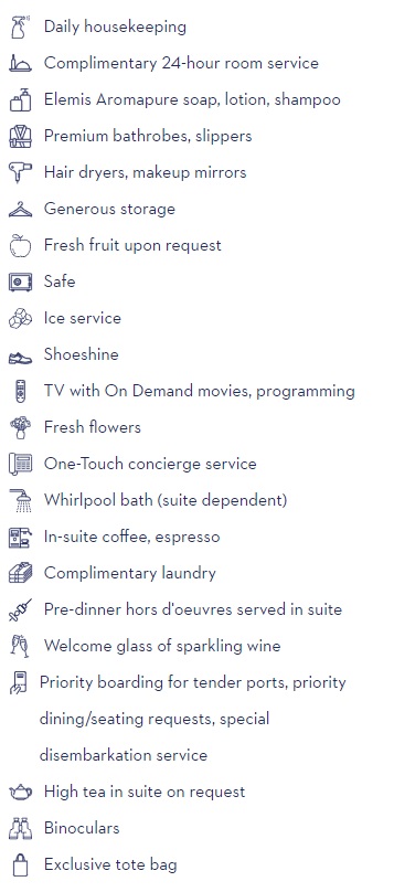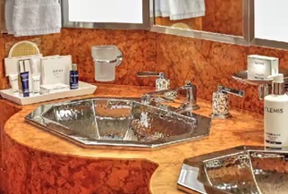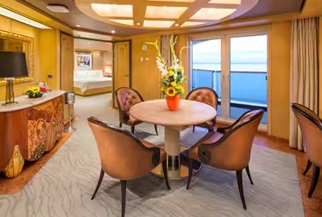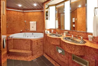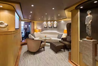 The suite has three separate areas: the bedroom, the living room, and the dining room. You have a guest half-bathroom near the entry. There's also a pantry (with its own separate hallway door, so that your steward can replenish supplies without disturbing you) with a fridge, coffee maker, and microwave.