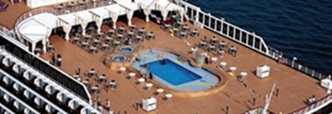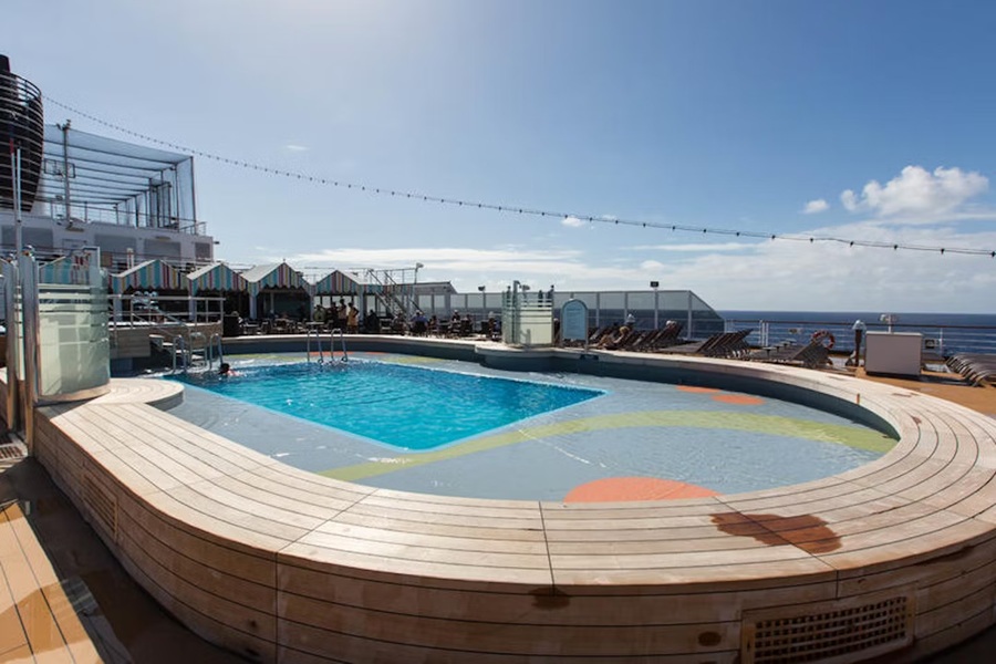 The Sea View Pool (aft Deck 9 - Lido Deck) is the smaller of the two swimming pools on the Nieuw Amsterdam (the other is the Lido Pool, midships on Lido Deck). The Sea View Pool is exclusively an outdoor pool and has incredible open views of the ocean on three sides.