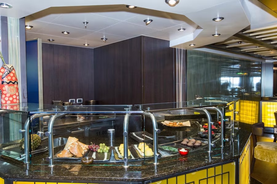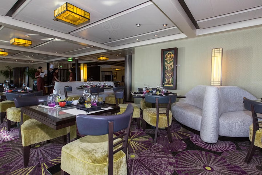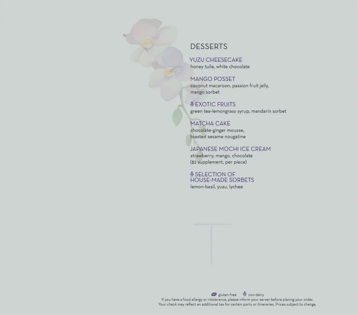 Tamarind (midships starboard side Deck 11 - Observation Deck) is Holland America's Asian Fusion cuisine specialty restaurant. As a specialty restaurant, there is an additional cost associated with it. One item on the menu (Wok-Seared Lobster) carries a supplemental charge.