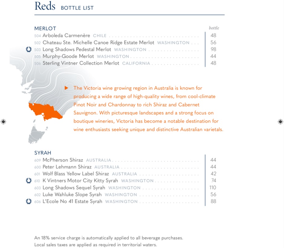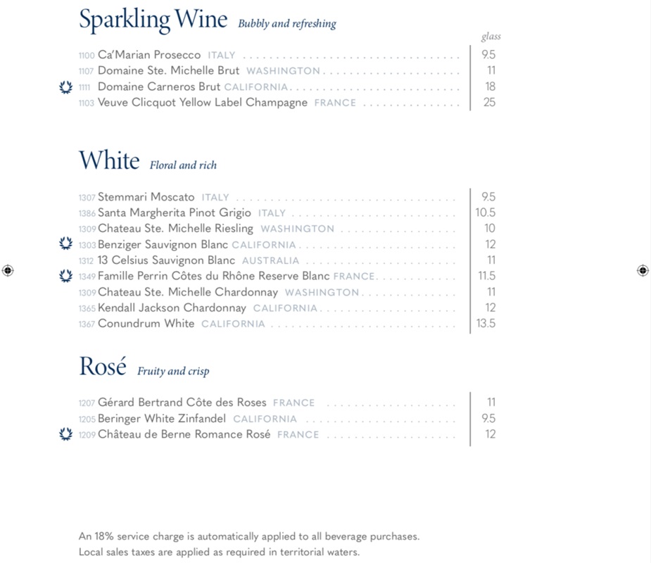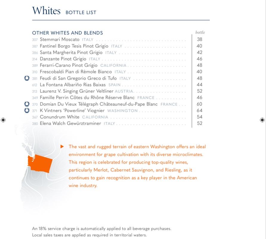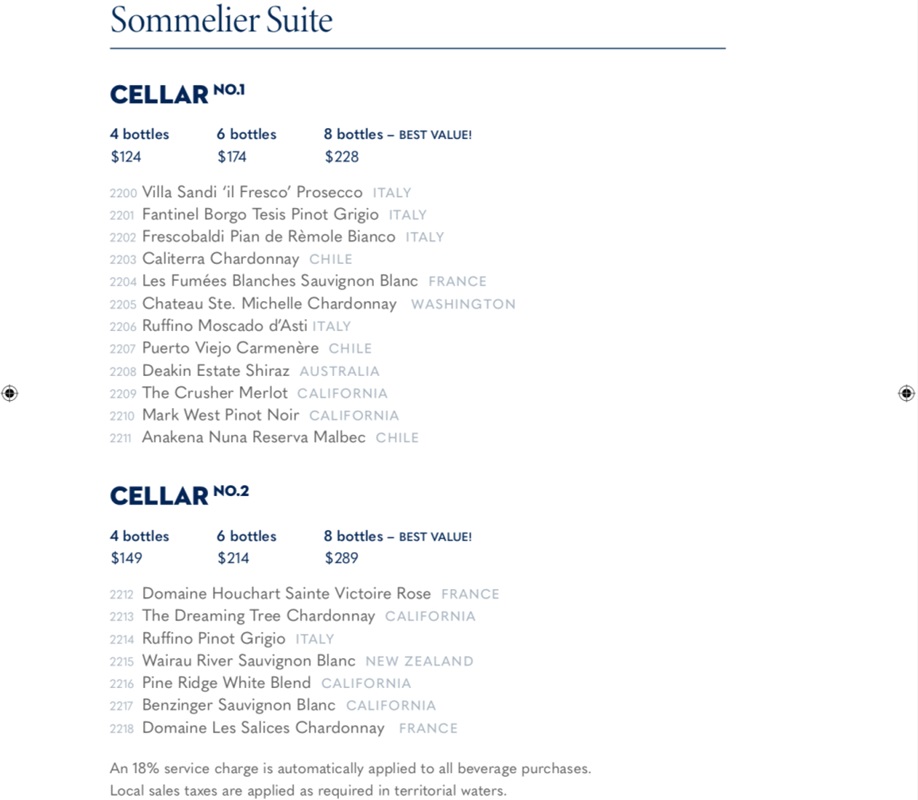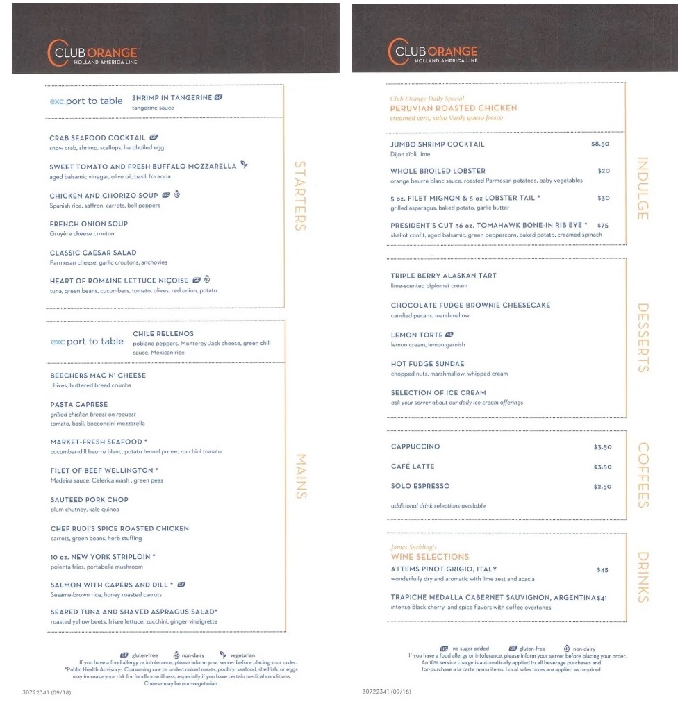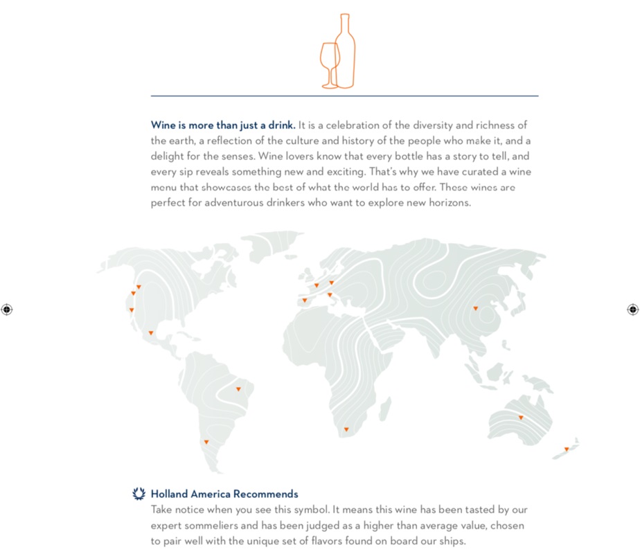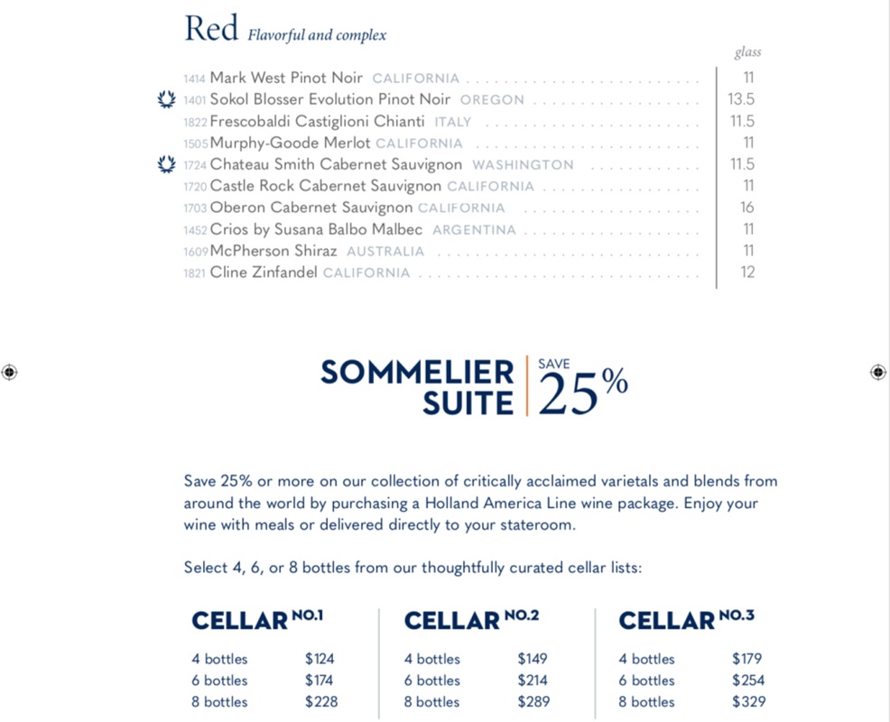 Below the menus, you will find the Holland America Wine List. As with the photos and menus, click on any segment to see the full gallery of large images of the thirteen parts of the Wine List.